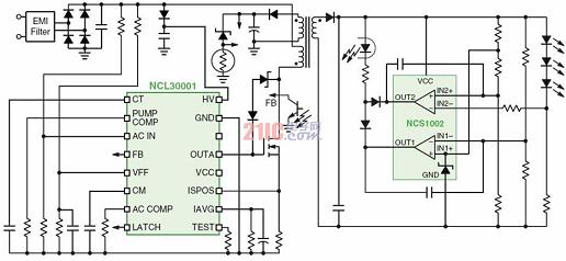 1)基于NCL30001的電流可調(diào)節(jié)恒流功率因數(shù)校正區(qū)域照明LED電源有些區(qū)域照明應用場合要求提供帶輸入功率因數(shù)校正的隔離型穩(wěn)壓輸出電壓。這些應用通常采用兩段式的電源轉(zhuǎn)換架構(gòu),其中的升壓功率因數(shù)校正(PFC)將交流輸入線路電壓轉(zhuǎn)換及預穩(wěn)壓為直流400V電壓,然后提供電壓給可以是任何適當拓撲結(jié)構(gòu)的常規(guī)直流-直流(DC-DC)轉(zhuǎn)換器(功率不超過150W的應用中通常是反激轉(zhuǎn)換器)。