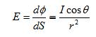 照度(Luminosity)指物體被照亮的程度,采用單位面積所接受的光通量來(lái)表示,表示單位為勒[克斯](Lux),即lm/m2。1勒[克斯]等于1流[明](lm)的光通量均勻分布于1m2面積上的光照度。LED陣列的照度是多個(gè)單個(gè)LED照度的線性疊加。因此只分析單個(gè)LED照度。通常LED所照射的目標(biāo)距離比LED本身大的多,在這種情況下將LED發(fā)光管簡(jiǎn)化為一個(gè)有一定空間光強(qiáng)分布的點(diǎn)光源。點(diǎn)光源的特點(diǎn)是能以4立體角向周圍空間發(fā)出相同發(fā)光強(qiáng)度的光輻射。假設(shè)面元dS接受LED點(diǎn)光源S的光照,設(shè)點(diǎn)光源S至面元dS的距離為r,并且點(diǎn)光源發(fā)出的元光束的光軸與面元的法線N之間的夾角為,則面元上的照度為: