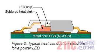 熱量從LED封裝芯片開始傳遞,相關(guān)的數(shù)據(jù)由供應(yīng)商提供。圖2中顯示的是常見的導(dǎo)熱結(jié)構(gòu)。一個LED燈大約50%的結(jié)點至環(huán)境的熱阻由LED封裝所引起。