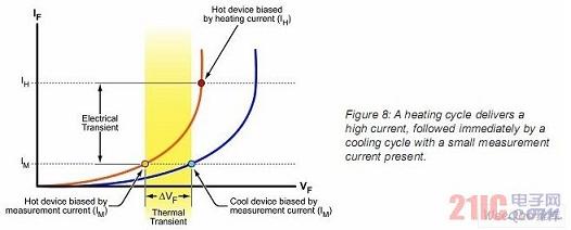 注意,當(dāng)PN結(jié)前向電流突然被停止(在測試過程中),不可避免的發(fā)生電瞬態(tài)現(xiàn)象。這個瞬態(tài)現(xiàn)象會持續(xù)很短的一段時間,在這段時間內(nèi)前向電壓的改變無法描述LED芯片的溫度的改變。因此,在進行測量時必須給電瞬態(tài)現(xiàn)象消失留有一個時間上的延遲。