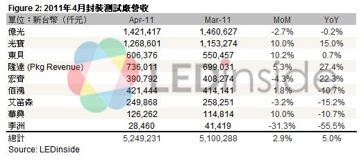 - 011年4月臺灣上市上柜LED廠商營收總額約96.2億元