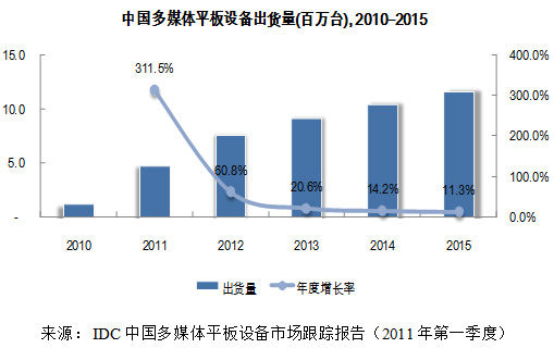 不過,第二季度隨著iPad2 供貨充足以及大量其他核心廠商的新品進(jìn)入市場,IDC預(yù)計(jì)中國多媒體平板設(shè)備市場仍將保持超過40%的高速增長。該機(jī)構(gòu)上調(diào)2011年度中國多媒體平板設(shè)備出貨量的預(yù)期數(shù)據(jù)至468萬臺(tái),并預(yù)計(jì)2015年出貨量達(dá)到1154萬臺(tái)。