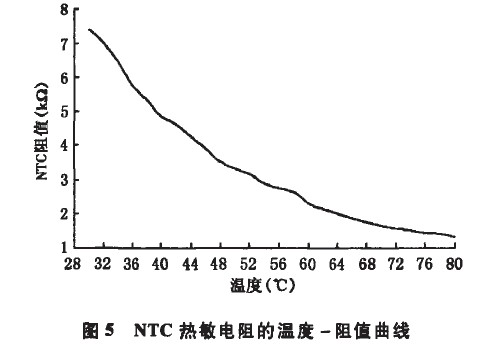 控制電路阻值與輸出總電流的關(guān)系列于表1,其中R為控制電路的等效電阻。經(jīng)過(guò)在恒溫箱中測(cè)試,每2℃記錄1組數(shù)據(jù)得到如圖5所示的NTC熱敏電阻的溫度一阻值曲線。該方案中,驅(qū)動(dòng)電源通過(guò)接收到反饋的溫度信息來(lái)控制輸出電流,根據(jù)圖5中NTC的溫度與阻值的關(guān)系,只要找到輸出電流隨總阻值的變化關(guān)系(如圖6所示),再進(jìn)行適當(dāng)?shù)碾娮杵ヅ洌憧烧业綔囟扰c驅(qū)動(dòng)器輸出電流的關(guān)系。