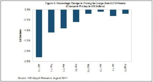 據IHS iSuppli公司的液晶顯示器(LCD)價格研究報告,8月份大尺寸LCD面板價格下降速度預計略慢于7月,供應商積極降低產能利用率預計會防止面板價格進一步下滑。