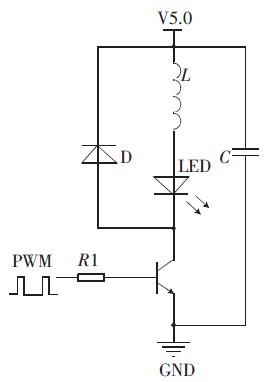 圖1 所示為驅(qū)動電路, 電感值的選擇以及PWM 波的頻率選擇在此驅(qū)動電路中相當(dāng)重要。選擇C8051330 芯片作為PWM 波的輸出, 采用定時器翻轉(zhuǎn)控制高低電平的時間,從而控制PWM 波的占空比。