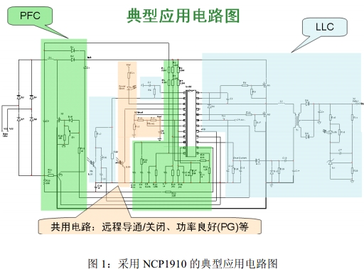圖1是采用NCP1910的典型應用電路圖共用電路,它包括遠程PFC段、LLC段,以及實現(xiàn)導通/關閉、功率良好(PG)等的共用電路。