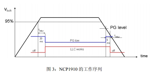 NCP1910的工作序列如圖3所示,如果PFC未就緒,LLC就不能啟動;一旦PFC就緒,就會開始一段20ms的延遲;延遲結束后PGout引腳假定為低電平,LLC可以開始工作。在撥除交流輸入關閉電源時Vbulk降低,到達PG信號時,PGout引腳被釋放(開路);如果Vbulk到達LLC停止電平,LLC停止工作;或者如果Vbulk緩慢下降,如處在輕載狀態(tài),LLC會在PGout引腳被釋放5ms后停止工作。