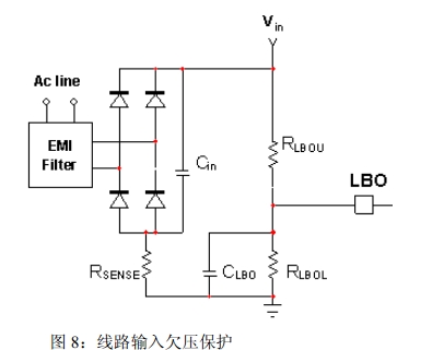 •可調節(jié)輸入欠壓(BO),F(xiàn)B引腳電壓占Vbulk的一部分,不需要高壓感測軌,可以省電;