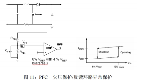 5.欠壓保護(UVP)/反饋環(huán)路異常保護:UVP可以防止在反饋故障條件下啟動。當VFB<8%VPREF=0.2V時,UVP激活,器件關閉;當VFB高于12%VPREF=0.3V時,器件自動開始工作。