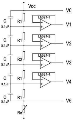 在圖1中,在各輸出端增加了運(yùn)算放大器LM324。LM324是一個(gè)具有四運(yùn)放的可使用正負(fù)電源工作的運(yùn)算放大器。它的每一個(gè)運(yùn)放都接成電壓跟隨器的形式,使得V1、V2等輸出端的驅(qū)動(dòng)能力大大增強(qiáng),可以大大改善LCD的對(duì)比度。電路中的Rc為10~20kΩ的可變電阻,在模塊對(duì)外部的接口處引出,可以隨時(shí)調(diào)整顯示的對(duì)比度。