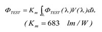 yaux,TEST (λ)為不點亮待測樣品,點亮輔助燈,在此系統(tǒng)下的光譜輻射計的讀值;yaux,REF (λ)則為不點亮參照標(biāo)準(zhǔn)燈,點亮輔助燈時,在此系統(tǒng)下的光譜輻射計讀值。從測得的ΦTEST (λ)(單位:W/奈米)總分光輻射通量,可使用公式(3)計算總光通量 ΦTEST (單位:流明)。