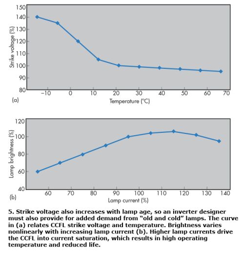 LCD工作時的環(huán)境溫度是背光驅(qū)動器設計人員需要考慮的一個關鍵因素。CCFL啟動或起始電壓與溫度成反比。圖5a顯示了CCFL起始電壓與溫度之間的典型關系,圖5b則展示了與電燈電流增大相關的CCFL亮度變化曲線。