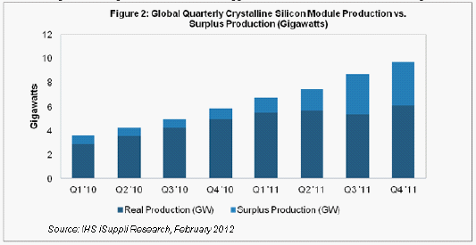 2011年光伏供應商的過剩產(chǎn)能達到9.96GW,比2010年的3.01GW劇增231%。去年的實際需求為22.7GW,高于2010年的15.7GW。