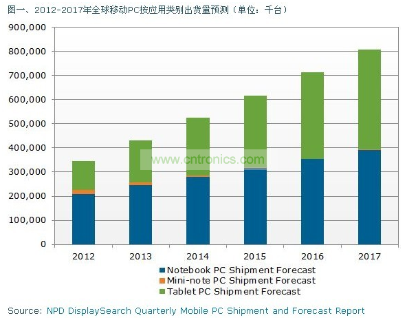 據(jù)DisplaySearch—平板電腦,如蘋果的ipad,預(yù)計(jì)將成為未來幾年移動(dòng)PC市場的主要增長動(dòng)力。根據(jù)NPD DisplaySearch季度移動(dòng)PC出貨與預(yù)測報(bào)告Quarterly Mobile PC Shipment and Forecast Report,2016年平板電腦出貨量將超過筆記本電腦,移動(dòng)PC(指包括筆記本電腦、上網(wǎng)本、平板電腦等)總出貨量將從2012年的3億4千700萬臺(tái)增長到2017年8億900萬臺(tái)。
