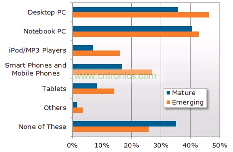 NPD DisplaySearch全球電視消費(fèi)者換機(jī)調(diào)查還對(duì)家庭戶進(jìn)行了關(guān)于在其他設(shè)備上收看電視視頻節(jié)目的調(diào)研,發(fā)現(xiàn)在新興市場(chǎng)越來越多的家庭使用除電視以外的設(shè)備,包括平板電腦、智能手機(jī)和MP3播放器。