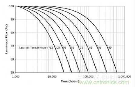 我們知道LED的壽命完全是由它的結(jié)溫決定的,美國Cree公司就給出了結(jié)溫和壽命的曲線。