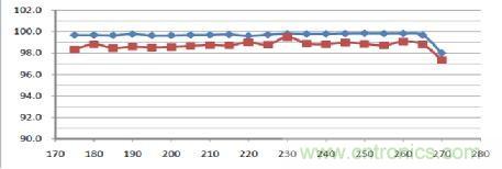 圖中的藍色為恒流源本身的效率,紅色為包括了整流器在內(nèi)的全部電源的效率。由圖中可見當市電電壓從175V增加到265V時,它的效率一直保持在99%以上。這樣高效率的恒流源,放到鋁基板上以后就基本上不會增加鋁基板的熱量,也就不會降低光引擎的熱光效,更不會降低光引擎的壽命了!此外它的效率也不隨溫度而變化: