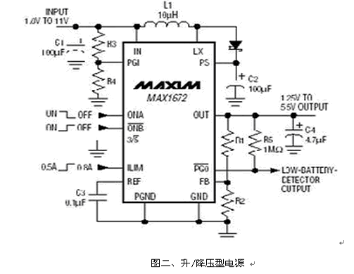 設(shè)計(jì)者也可以直接用一組Buck/Boost電源IC產(chǎn)生所需要的電壓輸出, 圖二便是一組直接升/降壓轉(zhuǎn)換IC。它結(jié)合了一組升壓轉(zhuǎn)換器和線性穩(wěn)壓器,提供既可以升壓,也可以降壓的轉(zhuǎn)換方案。這個(gè)轉(zhuǎn)換器在輸入電壓高于或低于輸出電壓時(shí)能夠提供一個(gè)穩(wěn)定的輸出,允許輸入范圍:1.8V至11V,可預(yù)置為3.3V或5V輸出,也可以使用兩個(gè)分壓電阻得到可調(diào)節(jié)的輸出電壓:1.25V至5.5V,效率可達(dá)85%。如果需要3.5V至4V之間的輸出,可以用升壓轉(zhuǎn)換器與線性穩(wěn)壓器相組合的方式實(shí)現(xiàn)。如:MAX1606升壓轉(zhuǎn)換器與MAX8512線性穩(wěn)壓器的組合。