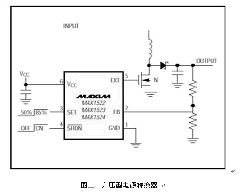 有些設(shè)計(jì)者為了追求較高的轉(zhuǎn)換效率, 選擇了升壓方式,產(chǎn)生一組高于輸入的穩(wěn)定輸出, 如圖三的升壓架構(gòu)。由于功率開關(guān)MOSFET是外置的, 可提供較大的輸出功率。在輸出功率許可的條件下,也可以選擇內(nèi)置MOSFET功率開關(guān)的升壓轉(zhuǎn)換器,如MAX1722, 可有效節(jié)省空間、降低成本。