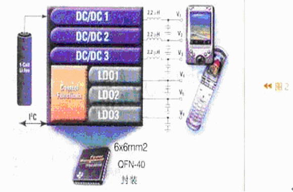 圖2是TI公司的一種電源管理IC(TPS65021)的功能結構示意圖。它由1節(jié)鋰離子電池供電,由微處理器通過I2C與器件接口。TPS65021內部有控制功能電路及6個電源(3個DC/DC轉換器,3個線性穩(wěn)壓器LDO,輸出V1-V6電壓)。它可以給手機供電及實現(xiàn)負載管理。