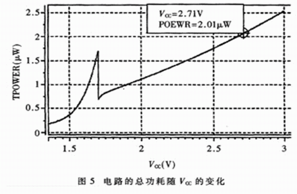 從圖5的仿真波形中可以看出:當(dāng)Vcc的電壓正常時(shí),電路的總功耗隨著Vcc的升高而增大,當(dāng)Vcc=2.7V時(shí),總功耗約為2μW,可見(jiàn)電路的靜態(tài)功耗很低。