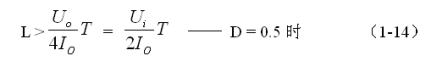 (1-13)和(1-14)式,就是計算串聯(lián)式開關電源儲能濾波電感L的公式(D = 0.5時)。(1-13)和(1-14)式的計算結果,只給出了計算串聯(lián)式開關電源儲能濾波電感L的中間值,或平均值,對于極端情況可以在平均值的計算結果上再乘以一個大于1的系數(shù)。