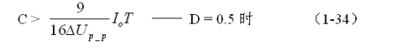 當(dāng)開關(guān)K的占空比D小于0.5時,由于流過儲能濾波電感L的電流會不連續(xù),電容器放電的時間將遠(yuǎn)遠(yuǎn)大于電容器充電的時間,因此,開關(guān)電源濾波輸出電壓的紋波將顯著增大。另外,開關(guān)電源的負(fù)載一般也不是固定的,當(dāng)負(fù)載電流增大的時候,開關(guān)電源濾波輸出電壓的紋波也將會增大。因此,設(shè)計開關(guān)電源的時候要留有充分的余量,實際應(yīng)用中最好按(1-33)式計算結(jié)果的2倍以上來計算儲能濾波電容的參數(shù)。