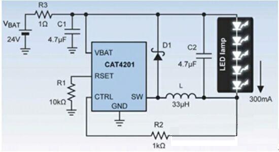 圖2說明了如何利用CAT4201從一個24V電源來驅動5只1W的LED。LED電流由外部電阻R1來設定。CAT4201降壓LED驅動器利用兩階段開關作業(yè)來提供精確的平均電流。在第一階段,位于內(nèi)部的CAT4201 FET開關將SW端連接到地,使電流上升并對電感充電。