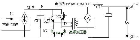 由電路可以看出,市電經(jīng)整流濾波后變?yōu)?11V高壓,經(jīng)K1~K4功率開(kāi)關(guān)管有序工作后,變?yōu)槊}沖信號(hào)加至高頻變壓器的初級(jí),脈沖的高度始終為311V。當(dāng)K1,K4開(kāi)通時(shí),311V高壓電流經(jīng)K1正向流入主變壓器初級(jí),經(jīng)K4流出,在變壓器初級(jí)形成一個(gè)正向脈沖。