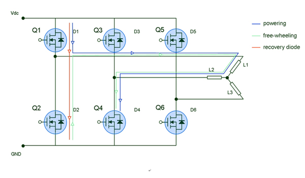 標(biāo)準(zhǔn)的三相功率級(powerstage)被用來驅(qū)動(dòng)一個(gè)三相無刷直流電機(jī),如圖1所示。功率級產(chǎn)生一個(gè)電場,為了使電機(jī)很好地工作,這個(gè)電場必須保持與轉(zhuǎn)子磁場之間的角度接近90°。六步序列控制產(chǎn)生6個(gè)定子磁場向量,這些向量必須在一個(gè)指定的轉(zhuǎn)子位置下改變?;魻栃?yīng)傳感器掃描轉(zhuǎn)子的位置。為了向轉(zhuǎn)子提供6個(gè)步進(jìn)電流,功率級利用6個(gè)可以按不同的特定序列切換的功率MOSFET。下面解釋一個(gè)常用的切換模式,可提供6個(gè)步進(jìn)電流。