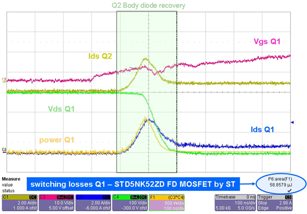 我們對比測試了標(biāo)準(zhǔn)的MOSFET和快恢復(fù)MOSFET。ST推出的STD5NK52ZD(SuperFREDmesh系列)放在Q2(LF)中,如圖4b所示。在Q1MOSFET(HF)的導(dǎo)通工作期間,開關(guān)損耗降低了65%。采用STD5NK52ZD時(shí)效率和熱性能獲得很大提升(在不采用散熱器的自由流動(dòng)空氣環(huán)境下,殼溫從60°C降低到50°C)。在這種拓?fù)渲?,MOSFET內(nèi)部的體二極管用作續(xù)流二極管,采用具有快速體二極管恢復(fù)特性MOSFET更為合適。