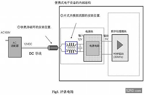 根據(jù)評(píng)估結(jié)果的測(cè)試數(shù)據(jù),噪聲的發(fā)射范圍從幾十MHz到800MHz都有。因此,可以推斷噪聲是從DC/DC轉(zhuǎn)換器和內(nèi)部數(shù)字處理電路傳向AC適配器,通過(guò)電源線發(fā)射出來(lái)的。