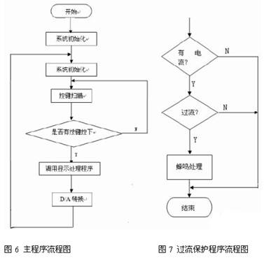 軟件控制程序由主程序和過流保護程序兩部分,其主要實現(xiàn)步進加減、D/A 轉(zhuǎn)換、鍵盤 掃描、LED 顯示、電流報警等功能。