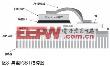 圖3顯示了帶基板的功率模塊的結(jié)構(gòu)。兩側(cè)都帶薄銅層的陶瓷襯底被焊接在基板上。IGBT芯片被焊在設(shè)計好的銅層上。芯片的表面通過綁定線(bondingwire)壓焊到銅層上。大多數(shù)標(biāo)準(zhǔn)模塊采用這種制作方法。目前70%到80%的功率模塊都按照標(biāo)準(zhǔn)模塊結(jié)構(gòu)來制造。陶瓷一般采用Al2O3,基板采用銅為材料。IGBT底板通過導(dǎo)熱硅脂安裝散熱器。