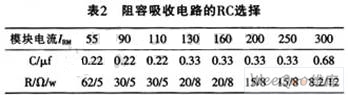 模塊過壓保護(hù)一般也可采用阻容吸收法。對于持續(xù)時間較短,能量不大的過電壓,一般可在模塊兩端并聯(lián)阻容吸收電路,用吸收電容把過電壓的電磁能量變成靜電能量存貯起來。而用吸收電阻不但可以防止電路振蕩,還可限制晶閘管導(dǎo)通時電容放電所產(chǎn)生的開通損耗和di/dt值。并聯(lián)在晶閘管開關(guān)模塊的RC值可參考表2。