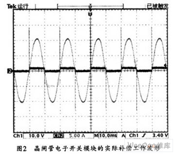 在無功補(bǔ)償實(shí)際應(yīng)用中,可將晶閘管電子開關(guān)模塊用在TSC低壓無功補(bǔ)償以替代接觸器,這樣,就可以在開關(guān)電壓過零時投入補(bǔ)償電容量,從而避免了沖擊電流的產(chǎn)生和瞬間電網(wǎng)電壓的波動。圖2所示是其工作波形圖。
