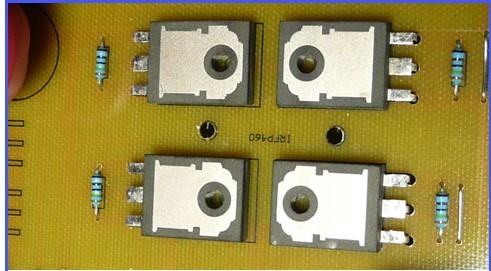 前級推挽部分的供電采用對稱平衡方式,這樣做有二個好處,一是可以保證大電流時的二個功率管工作狀態(tài)的對稱性,保證不會出現(xiàn)單邊發(fā)熱現(xiàn)象;二是可以減少PCB反面堆錫層的電流密度,當然,也可以大大減小因為電流不平衡引起的干擾。高壓整流快速二極管,用的是TO220封裝的RHRP8120,這種管子可靠性很好,我用的是二手管,才1元錢一個。高壓濾波電容是470uf/450V的,在可能的情況下,盡可能用的容量大一些,對改善高壓部分的負載特性和減少干擾都有好處。H橋部分用的是4個IRFP460,耐壓500V,最大電流20A,也可以用性能差不多的管子代替,用內(nèi)阻小的管子可以提高整機的逆變效率。H橋部分的電路采用的常規(guī)電路。