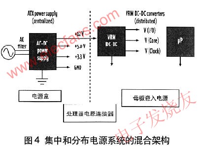 可以用集中和分布單元的組合設(shè)計(jì)電源系統(tǒng),如圖4所示的混合電源系統(tǒng)。集中電源產(chǎn)生5.0V和3.3V邏輯電源(其輸入為ac線)以及分布到電壓穩(wěn)壓器模塊(VRM)的12Vdc電平。用VRM為高性能處理器提供很大電流、低電壓芯核和I/O電壓。VRM電源變換器放置在母板靠近處理器的“負(fù)載點(diǎn)”處,這可減少電路板跡線電壓降,在不同的情況下,跡線電壓降對(duì)于有效的變換器工作是不能接受的。