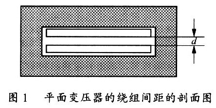在平面型變壓器里,其“繞組”是做在印制電路板上的扁平傳導(dǎo)導(dǎo)線或是直接用銅泊。扁平的幾何形狀降低了開關(guān)頻率較高時趨膚效應(yīng)的損耗,也就是渦流損耗。因此,能最有效地利用銅導(dǎo)體的表面導(dǎo)電性能,效率要比傳統(tǒng)變壓器高得多。圖1給出了一個平面變壓器的剖面圖,并且利用兩層繞組間距離的不同,而獲得在不同間隙下的漏感和交流阻抗值。