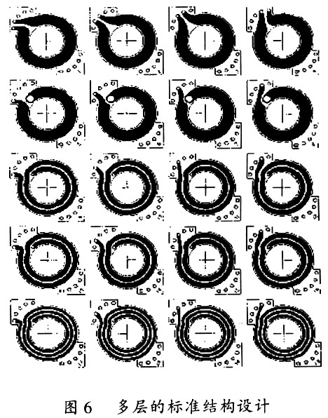 在雙面PCB板的每一層都是由一到多匝的繞組組成的,而且所有的層都保持著一樣的物理特性:即相同的形狀和相同的外部連接點(diǎn)。在有些多匝的層次中,這個外部連接點(diǎn)是不同匝數(shù)間的電氣連接點(diǎn)。如果有些層只有一匝,它也可以被印制在PCB的雙面來降低交流阻抗。使用銅箔直接印制在PCB板上來替代傳統(tǒng)的導(dǎo)線,即使在許多需要很多匝數(shù)的開關(guān)電源中,變壓器依舊能保持一個很小的體積,這便大大減小了整機(jī)的體積。具體的設(shè)計(jì)步奏和注意事項(xiàng)請參閱文獻(xiàn)[3]。圖6顯示了一個頂層的標(biāo)準(zhǔn)匝數(shù)設(shè)計(jì)的例子,它使用的是罐形(RM)磁芯。