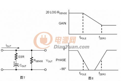 輸出電容的ESR和反饋網(wǎng)絡的電阻(R1+R2=RFB)反映出輸出濾波器傳輸函數(shù)的特性。圖7的電路分析給出ESR和RSENSE的影響。