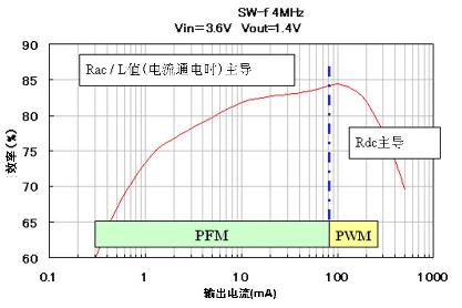 DC-DC轉(zhuǎn)換器的電源轉(zhuǎn)換效率和功率電感性能之間的關(guān)聯(lián)如圖3所示。PFM是指手機在待機狀態(tài)下保持低電流負荷的模式,這時電源轉(zhuǎn)換效率性能是與功率電感的Rac(交流電阻)以及電流-感值偏執(zhí)特性相關(guān)。圖4當中顯示了各功率電感的Rac特性以及圖5中開關(guān)頻率數(shù)是4MHz的DC-DC轉(zhuǎn)換器IC的電源轉(zhuǎn)換效率特性。