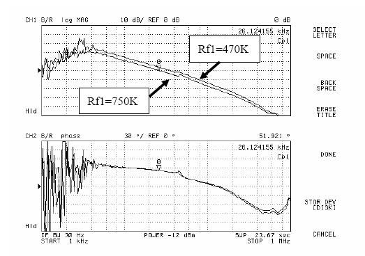 圖5和圖6是用網(wǎng)絡(luò)分析儀進(jìn)行AP3406環(huán)路增益測試的結(jié)果。由圖可以看出,當(dāng)Rf1從300k變化到470k,再變化到750k,系統(tǒng)的環(huán)路增益的幅頻特性不斷向下移動,同時相頻特性基本不變。于是系統(tǒng)的帶寬和相位裕度都有較大改變,測試結(jié)果如表1所示。