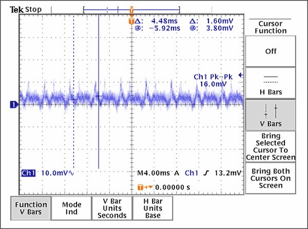 [page]經(jīng)驗證明,抑制PLL雜散的有效途徑是合理的接地、電源布局和去耦技術(shù),本文討論的布線原則是減小PLL雜散分量的良好設(shè)計開端。考慮到電荷泵中存在較大的電流變化,采用星形拓撲非常必要。如果沒有足夠的隔離,電流脈沖產(chǎn)生的噪聲會耦合到VCO電源,對VCO頻率進行調(diào)制,通常稱為“VCO牽引”。通過電源線間的物理間隔和每個VCC引腳的去耦電容、合理放置接地過孔、引入一個串聯(lián)的鐵氧體元件(作為最后一個手段)等措施可以提高隔離度。上述措施并不需要全部用在每個設(shè)計中,適當(dāng)采用每種方式都會有效降低雜散幅度。圖9提供了一個由于不合理的VCO電源去耦方案所產(chǎn)生的結(jié)果,電源紋波表明正是電荷泵的開關(guān)效應(yīng)導(dǎo)致電源線上的強干擾。值得慶幸的是,這種強干擾可以通過增加旁路電容得到有效抑制。圖10顯示的是在電路改變后,在同一點的測量結(jié)果。
