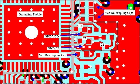 圖6.MAX2827參考設(shè)計板上PLL濾波器元件布置和接地示例