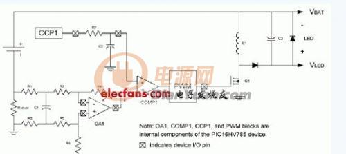 然后,應(yīng)用程序代碼可以測量供電電壓(利用片上集成的10位A/D轉(zhuǎn)換器)和供電電流,從而保證驅(qū)動LED工作在恒定功率模式。隨著電池輸入電壓的變化,D/A電路(采用CCP外設(shè)實現(xiàn))將產(chǎn)生新的參考電壓值進(jìn)行補償。