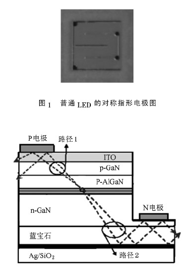 圖2 模擬了光在ODR LED 內(nèi)部發(fā)射時所經(jīng)過的路徑: 當(dāng)在p,n 電極上加上正向壓降時,p 區(qū)空穴與n 區(qū)電子向有源區(qū)運(yùn)動并發(fā)生輻射復(fù)合,發(fā)出的光線有兩條路徑,一條直接射出如圖2 中路徑1,另一條射向襯底下的全方位反射鏡,并發(fā)生反射,從頂面或側(cè)面射出如圖2 中路徑2,從而增加光射出的路徑,增強(qiáng)LED的光通量與光效.