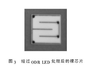 本批實(shí)驗(yàn)樣品采用揚(yáng)州華夏集成光電有限公司生產(chǎn)的芯片.對一塊外延片整體進(jìn)行測試,發(fā)現(xiàn)測試結(jié)果基本一致后試制成芯片. 將該外延片一半制做成普通LED 芯片,另一半制做ODR LED 芯片,芯片的尺寸為40 mil. 選取一個單元中的ODR LED芯片如圖3 所示,與圖2 比較,可以明顯看出芯片亮度不同.