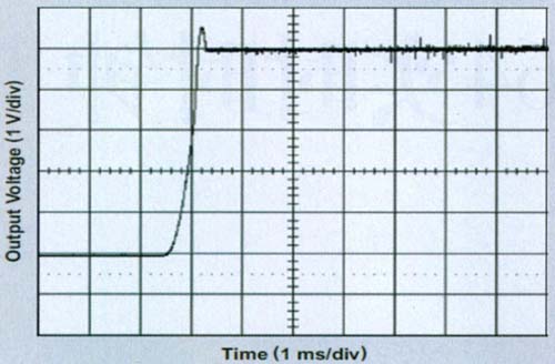 在一些典型的啟動(dòng)應(yīng)用中,TPS64203限流值慢慢上升,以提供限流的受控軟啟動(dòng)。在這種應(yīng)用中,限流電路和軟啟動(dòng)均無(wú)效;因此,啟動(dòng)浪涌電流會(huì)很大,而輸出電壓會(huì)稍稍過(guò)沖,如圖 4 所示。
