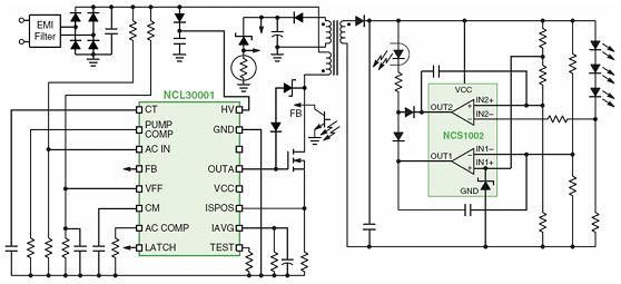 NCL30001是一種單段拓?fù)浣Y(jié)構(gòu)LED驅(qū)動方案,其靈活的特性非常適合應(yīng)用于新的LED照明產(chǎn)品,其他規(guī)格特性還包括高壓啟動電路、電壓前饋以改善環(huán)路響應(yīng)、輸入欠壓檢測、內(nèi)部過載定時(shí)器、閂鎖輸入,以及減少輸入線路諧波的高精度乘法器。這種方案采用連續(xù)導(dǎo)電模式(CCM)工作,集成了PFC和隔離型DC-DC轉(zhuǎn)換電路,并提供恒定電流來直接驅(qū)動LED,相當(dāng)于將AC-DC轉(zhuǎn)換與LED驅(qū)動兩部分電路整合在一起,均位于照明燈具內(nèi),省去了LED光條中集成的線性或DC-DC轉(zhuǎn)換器。這種整體式方案的電源轉(zhuǎn)換段更少,減少元器件使用數(shù)量(如光學(xué)元件、LED、電子元件及印制電路板等),降低系統(tǒng)成本,并支持更高的LED電源總體能效。當(dāng)然,這種方案的功率密度更高,可能并不適合所有區(qū)域照明應(yīng)用,其光學(xué)圖案可能更適合較低功率的LED,典型應(yīng)用包括LED街燈、外墻燈、洗墻燈及電冰箱箱體照明等。